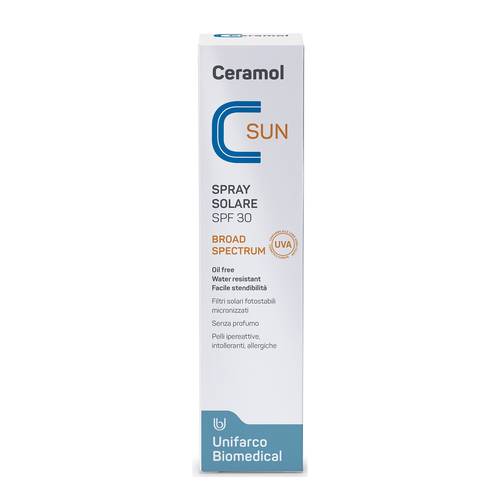 Ceramol SUN SPRAY SOLARE SPF 30Descrizione Spray solare attivo verso la protezione solare e nel mantenimento dell’emollienza della pelle. Questo garantisce una doppia difesa per la barriera cutanea. Contiene filtri broad spectrum che garantiscono un fattore di protezione alto (SPF 30) verso i raggi UVB e UVA. Questi filtri sono fotostabili e micronizzati e sono associati a lipidi epidermici che migliorano l’emollienza della barriera cutanea. Ideale per bambini, adulti e anziani con pelle ipereattiva, intollerante, allergica e/o a tendenza atopica. La formula oil-free lo rende particolarmente adatto anche per la pelle mista o a tende...